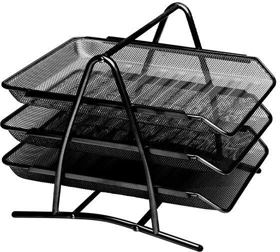 Fémhálós kivitelű háromszintes irattartó tálca, A/4 -es méretű iratok tárolására. Színek: fekete, ezüst.