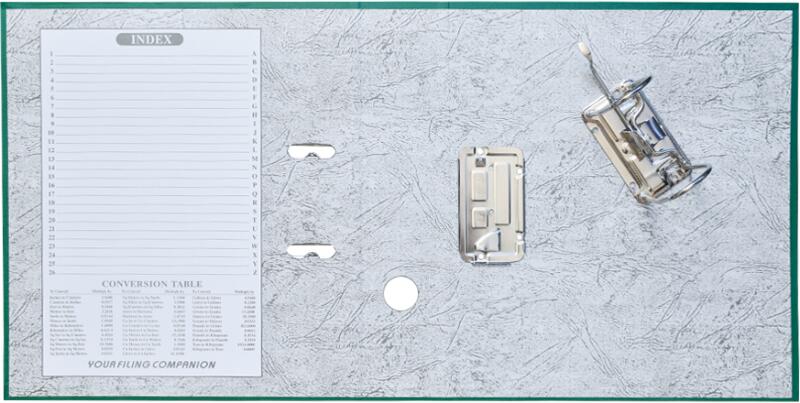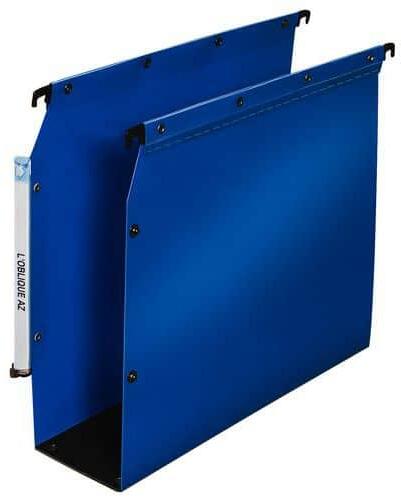 Lapos acél felfüggesztő rudak. Hátoldala polipropilén szalaggal megerősítve, 8/10-es hornyokkal a dokumentumok tárolására.