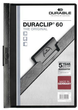 Klip mappa 60lap Durable Duraclip®, fekete Az eredeti DURACLIP® mappa PVC-ből készült, speciális rugalmas acél klippel. Ideális prezentációk, iratok, ajánlatok, konferenciák / szemináriumok jegyzeteinek vagy riportoknak lyukasztás nélküli lefűzérésre. A DURACLIP® 60 kapacitása 60 db A4 lap. Áttetsző előlappal és színes hátlappal. További kiegészítők kaphatók. Saját