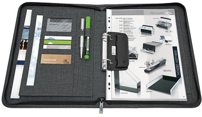 konferencia mappa eltávolítható, kiváló minőségű, 30 mm átmérőjű, kétgyűrűs mechanizmussal elhelyezhető benne spirálkötésű vagy szabvány jegyzettömb a nyílások lehetővé teszik a tömb behelyezését mind a négy oldalról - így ideális balkezesek számára is sok zseb és rugalmas, gumírozott hurkok biztosítanak helyet kártyák, tollak és kiegészítők számára z
