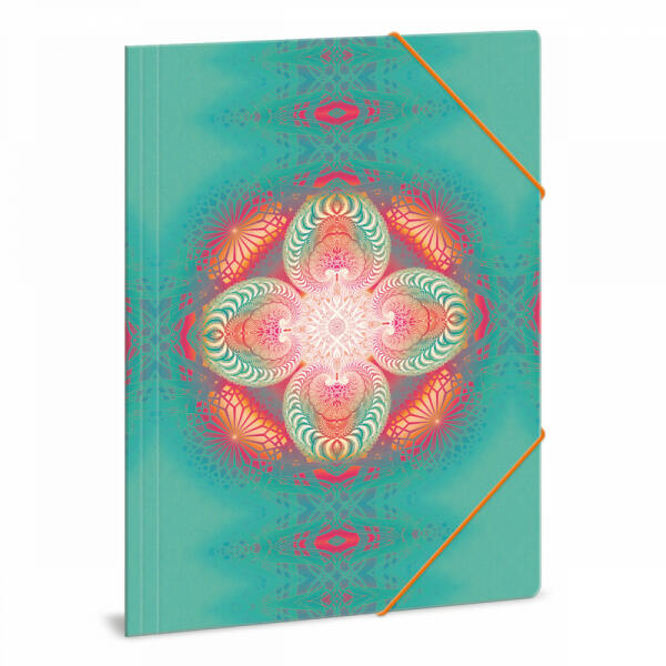 A/4 méretű gumis dosszié iratok, füzetek tárolására. 350 gr-os vastag kartonból készült dosszié lekerekített első sarkokkal, színes gumi zárópánttal. Külseje négy színnel, fényes fóliával nyomott. Belső oldala nyomatlan.