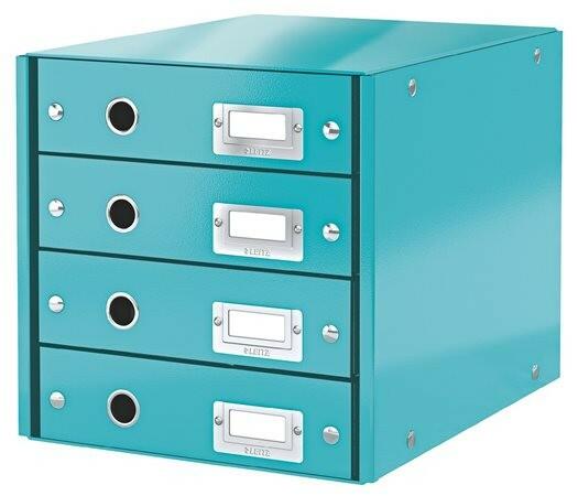 Irattároló, laminált karton, 4 fiókos, Leitz Click&Store, jégkék fiókos irattároló 4 fiókkal, A4 méretű lapok tárolására összehajtható, így helytakarékosan tárolható fém kihúzólyuk a fiókok könnyű használatának érdekében címketartó a tartalom könnyű beazonosításához a laminált felület tartós használatot tesz lehetővé belső méretek fiókonként (Sz