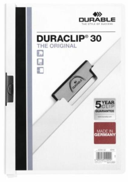 Az eredeti DURACLIP® mappa PVC-ből készült, speciális rugalmas acél klippel. Ideális prezentációk, iratok, ajánlatok, konferenciák / szemináriumok jegyzeteinek vagy riportoknak lyukasztás nélküli lefűzérésre. A DURACLIP® 30 kapacitása 30 db A4 lap. Áttetsző előlappal és színes hátlappal. További kiegészítők kaphatók. Saját logojával nyomtatva a DURACLIP® egy egyed