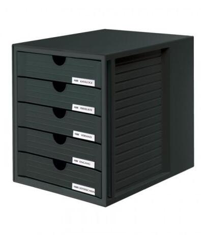 Műanyag fiókos doboz öt zárt fiókkal. Bármilyen targoncák számára kialakított polcon elfér, mivel a doboz magassága megegyezik az emelőkaros targoncák magasságával (275 × 330 × 320 mm). Doboz/fiók színe: fekete/fekete Méretek: 275 x 330 x 320 mm