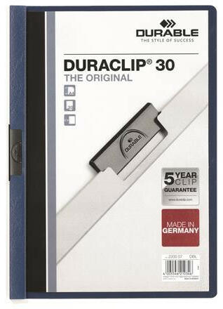Gyorsfűző, klipes, A4, DURABLE "DURACLIP® 30", sötétkék Az eredeti DURACLIP® mappa PVC-ből készült, speciális rugalmas acél klippel. Ideális prezentációk, iratok, ajánlatok, konferenciák, szemináriumok jegyzeteinek vagy riportoknak lyukasztás nélküli lefűzérésre. A DURACLIP® 30 kapacitása 30 db A4 lap. Áttetsző előlappal és színes hátlappal. Saját logojával nyomta