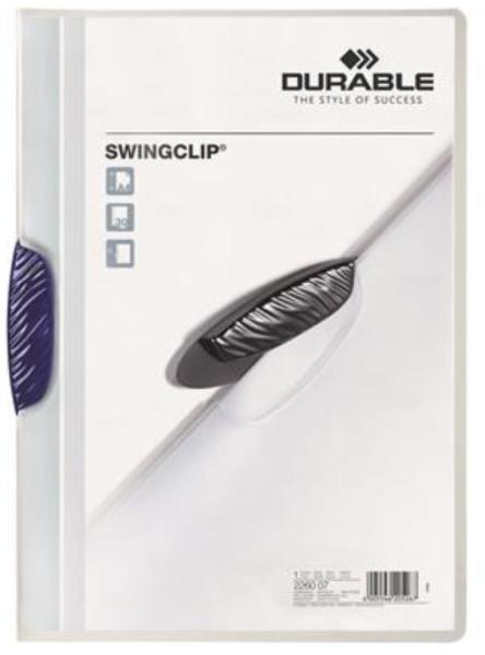 Gyorsfűző, klipes, A4, DURABLE Swingclip® 30, sötétkék (DB226007) A SWINGCLIP egy vonzó, fiatalos klipmappa, minden típusú prezentációhoz, irathoz, rugalmas polipropilénből. -egyszerű és gyors dokumentumkezelés az oldalra kihajtható műanyag klipnek köszönhetően -színes vagy áttetsző kapoccsal -A4 formátumú dokumentumokhoz, pl. ajánlatokhoz, megbeszélési és oktatási d