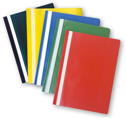Gyorsfűző PP pd A/4 5 db/csomag élénk színek Műanyag irattartó vegyes élénk színekben A/4-es iratok rendszerezésére, tárolására dokumentumok lyukasztás nélküli lefűzéséhez Átlátszó előlap, színes hátlap, feliratozható oldalcsík csomag tartalma: 1-1 db fekete, sárga, sötétkék, sötétzöld, piros