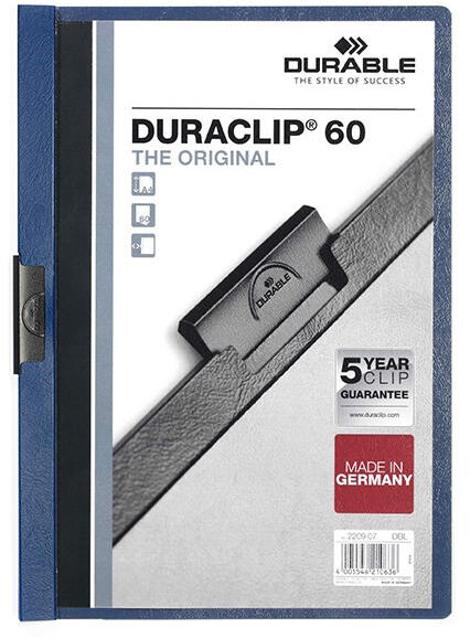 Klipmappa DURABLE Duraclip A/4 60 lapig sötétkék Műanyag anyagú, víztiszta előlappal, színes hátlappal, oldalán speciális elasztikus acél klippel ellátott mappa, amelyek lehetővé teszik az iratok lyukasztás nélküli lefűzését és elegáns prezentálását. A mappa maximum 30 lap lefűzésére alkalmas.