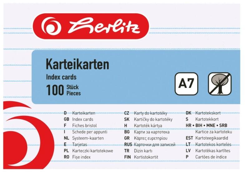 Herlitz kartotékkártya A7-es méretben, famentes, 170g/m2-es papírból, vonalas kivitelben, 100 ív/csomag, fehér színben.