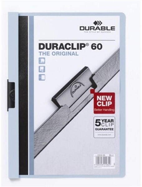 DURACLIP® az eredeti prezentációs mappa, áttetsző előlappal, 12 féle színben. Kapacitás: 1-60 A4 lap. Az eredeti DURACLIP® mappa PVC-ből készült, speciális rugalmas acél klippel. Ideális prezentációk, iratok, ajánlatok, konferenciák / szemináriumok jegyzeteinek vagy riportoknak lyukasztás nélküli lefűzérésre. A DURACLIP® 60 kapacitása 60 db A4 lap. Áttetsző előlappa