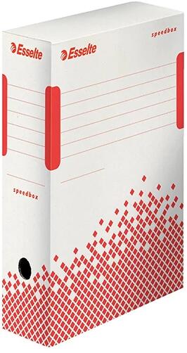 A Speedbox dobozok összeállítása könnyű és gyors. Dupla zárófüllel, és megerősített kihúzólyukkal rendelkezik. A/4 méretű lapok és A/4 méretű mappákban tárolt dokumentumok archiválására alkalmas. 100%-ban újrahasznosított karton alapanyag. FSC@ minősített. Méretek: 150 x 250 x 350.