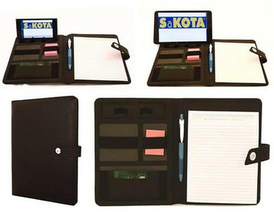 Konferencia mappa speciális telefon/tablat támasszal, hasznos rekeszekkel, jegyzettömbbel Szín: fekete, Méret: A/5