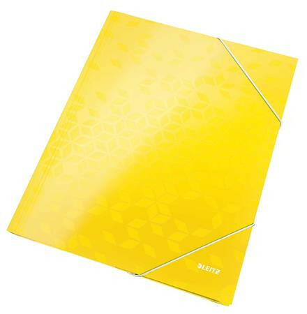 Gumis mappa, 15 mm, karton, A4, LEITZ "Wow", sárga - szembetűnő 3-pólyás mappa ragyogó színekben - a laminált felület fényes, kiváló minőségű megjelenést kölcsönöz - a pólyák megakadályozzák a lapok kicsúszását - gumiszalagos záródás a dokumentumok biztonságos szállításához - dobja fel irodáját vagy otthonát a WOW termékcsalád ragyogó színvilágú termékei