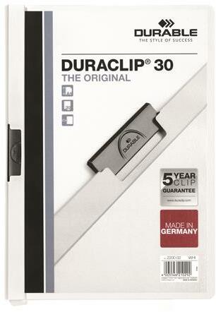 Az eredeti DURACLIP® tartós műanyagból készült klipmappa, ideális prezentációk, iratok, ajánlatok, konferenciák, szemináriumok jegyzeteinek vagy riportoknak lyukasztás nélküli lefűzérésre. -hátlap: színes kemény fólia -fedlap: átlátszó kemény fólia -speciális acél klippel, mely biztosan tartja a dokumentumokat -lyukasztás nélküli dokumentumkezelés -A4 formátumú d