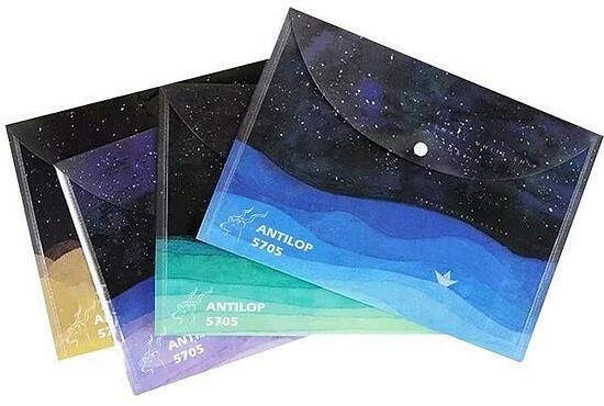 Antilop 5705 műanyag, patentos zárású irattasak, kevés irat gyors tárolására és szállítására. Normál vastag anyagú, nyomott mintás kivitelben. Méret: A/4-esSzín: fekete-lila, fekete-kék, fekete-sárga, fekte-zöld