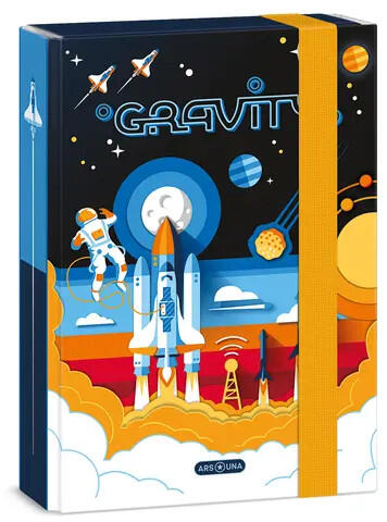 A/5 méretű füzetbox űrhajós grafikával Kemény és tartós kartonból 4 cm-es gerincvastagsággal 7 mm-es gumipánttal zárható Füzetek, iratok tárolására tökéletes Méret: 160x220x35 mm