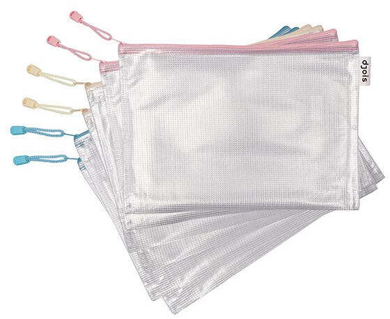Irattasak DJOIS A/4 cipzáras pasztell színekben 6 db/csomag Rendkívül tartós, félig átlátszó, rugalmas hálóval erősített, tartós PVC tasak vonzó, pasztell színekben. Dokumentumok, írószerek, apró tárgyak akár tematikus rendszerezésére is alkalmas. A fém cipzáron lévő, színes zsinór megkönnyíti a használatot. Oldalán található, logós hurok toll tartására alkalm