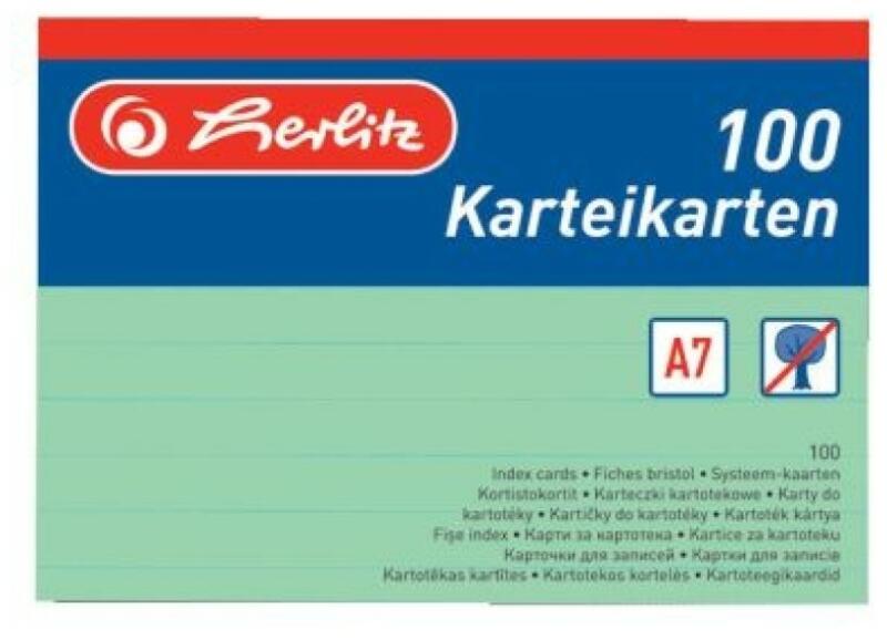 Kartotékkártya A7-es méretben, famentes, 170g/m2-es papírból, vonalas kivitelben, 100 ív/csomag, zöld színben.