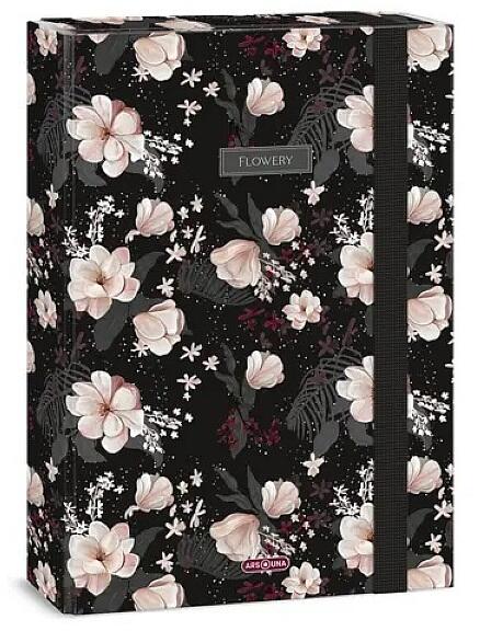 Ars Una füzetbox A4 - Flowery Black Virágos füzetbox A mappán fekete alapon virágok vannak. Az Ars Una kemény borítású füzetbox segítségével könnyedén tárolhatók a füzetek, tankönyvek akár a táskában is. A füzetbox segít rendezni a tanszereket és a gyűrődéstől is megóvja. Vastag és erős gumipánttal záródik. Belseje egy színnel nyomott. Méret: 33,5 x 23 x 4,5 cm
