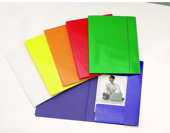 600 grammos kartonból készült, kívül vidám, neon színekre lakkozott, belül a borítóval azonos színű , gumis mappa 3 pólyával, hosszanti oldalán gumiszalaggal ellátva. A gumiszalag színe megegyezik a mappa színével. Kisebb mennyiségű papír tárolására alkalmas.