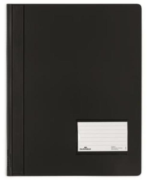 Gyorsfűző, A4, extra erős, széles, DURABLE, fekete (DB268001) Elegáns, áttetsző PVC gyorsfűző színes előlappal és hátlappal. -alkalmas a lyukasztott tasakok fűzésére az extra széles A4 formátumnak köszönhetően -rendkívül strapabíró, szakadásálló lefűzőszerkezet -90 x 57 mm-es névjegykártya formátumú feliratozó ablak az előlapon -extra belső zseb a hátlapon, a