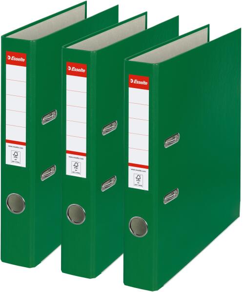 Esselte Economy mappakészlet, PP, részben újrahasznosítható, FSC tanúsítvánnyal, A4, 5 cm, 3 db, zöld Szabványos mechanizmusA külső borító polipropilénnel (PP) laminált, a belseje pedig szürke papírral borított. A könyökzseb cserélhető kartoncímkével a személyre szabáshoz. Fém markolattartó lyukkal, radógyűrűkkel és fémnyereggel védett élekkel ellátva a könny