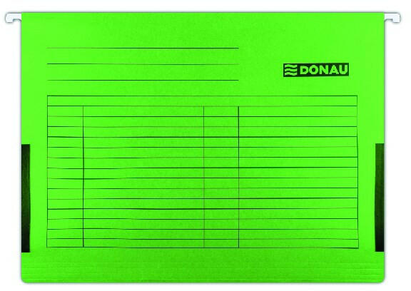 Függőmappa oldalvédelemmel DONAU A/4 karton zöld 25 db/doboz Függőmappák dokumentumok nyilvántartásához és tárolásához. A belsejében lévő tömör fémrúd meghosszabbítja a termék élettartamát. Az előnyomtatott táblázatnak köszönhetően a teljes felülete feliratozható. A mappák mozgatható műanyag csúszkákat tartalmaznak cserélhető címkével. Az oldallapok rögz