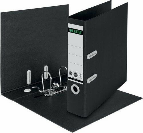 Emelőkaros dosszié A4 méret 80 mm gerincvastagság Anyaga: Újrahasznosított papírral borított karton Ragasztott címke Fekete szín Szabadalmaztatott 180°-ban nyíló emelőkaros szerkezet, Kihúzólyuk és radó gyűrű