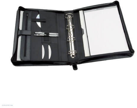 konferencia mappa eltávolítható, kiváló minőségű, 30 mm átmérőjű, kétgyűrűs mechanizmussal elhelyezhető benne spirálkötésű vagy szabvány jegyzettömb a nyílások lehetővé teszik a tömb behelyezését mind a négy oldalról - így ideális balkezesek számára is sok zseb és rugalmas, gumírozott hurkok biztosítanak helyet kártyák, tollak és kiegészítők számára z