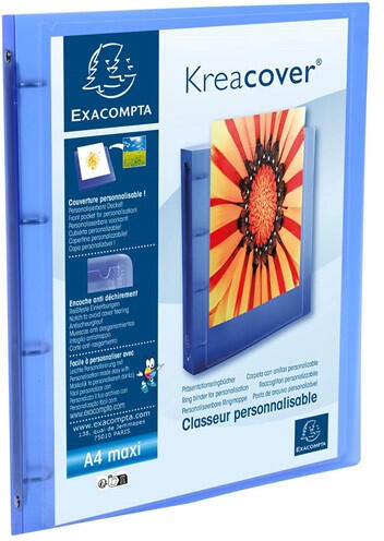 Gyűrűs könyv Exacompta Kreacover A/4 4 gyűrűs 20 mm gerinccel panorámás PP kék (15 mm) Gerincméret: 20 mm Gyűrűk száma: 4 Szín: kék 4 db O formájú gyűrűvel ellátva Gyűrű átmérője: 15 mm méret: 320x250 mm Alapanyag: PP Átlátszó külső zseb elől A/4 méretű dokumentumok számára ragasztott gerinccímkével