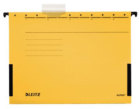 Függőmappa, oldalvédelemmel, karton, A4, LEITZ "Alpha", sárga (25db) - minőségi függőmappa V-alakú gerinccel - az oldalán található zsebek megakadályozzák a függőmappa tartalmát a kieséstől - zsebekkel a dokumentumok biztonságos tárolásához - erős és tartós fém fülek - a nagy méretű, erős, műanyag címketartóra akár 4 sorban is írhatunk - lyukak az elő-és hátl