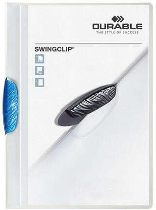 Clip-mappa Durable Swingclip A/4 30 lapig kék Méret: A/4 Lapkapacitás: 30 lap Szín: kék strapabíró PP anyagból készült klipes gyorsfűző áttetsző előlap, szürke hátlap, színes klip 30 lap lyukasztás néküli lefűzésére alkalmas