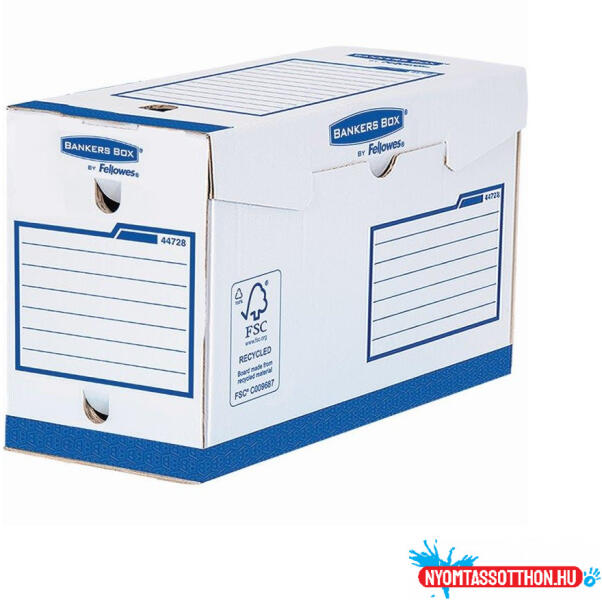 Archiváló doboz Extra erős, A4+, 150mm, Fellowes® Bankers Box Basic, 20 db/csomag, kék/fehér Extra erős A4+ méretű archiváló doboz Kiválóan alkalmas A4/A4+ méretű iratok, dokumentumok tárolására Feliratozható oldalsó és felső felületek 100%-ban újrahasznosított (FSC®) papírból készült Belső méretek: 14,4cm x 24,4cm x 33cm
