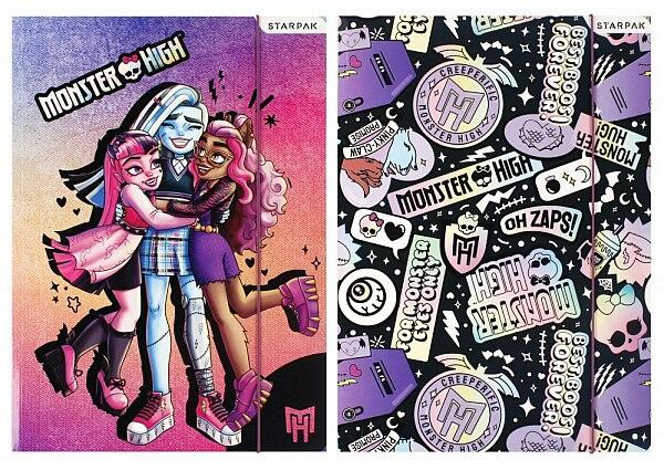 Monster High A4-es gumis mappa - kétféle A látványos irattartó mappa elején a Monster High lányok pózolnak, illetve hozzájuk kapcsolódó képeket, feliratokat láthattok. A gumis mappa maximum A4-es méretű lapok tárolására alkalmas. A kemény karton anyagú mappa megvédi a dokumentumokat a külső behatásoktól, nem gyűrődik meg, nem szakad el. A mappa fedele gumipánttal rögz