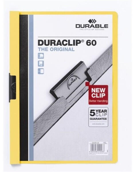 DURACLIP® az eredeti prezentációs mappa, áttetsző előlappal, 12 féle színben. Kapacitás: 1-60 A4 lap. Az eredeti DURACLIP® mappa PVC-ből készült, speciális rugalmas acél klippel. Ideális prezentációk, iratok, ajánlatok, konferenciák / szemináriumok jegyzeteinek vagy riportoknak lyukasztás nélküli lefűzérésre. A DURACLIP® 60 kapacitása 60 db A4 lap. Áttetsző előlappa