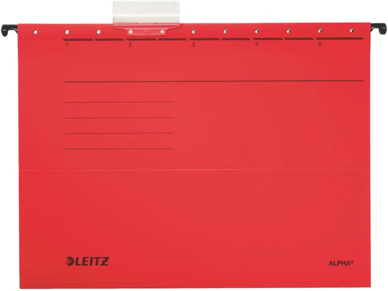 Függőmappa LEITZ Alpha Standard. Kiváló minőségű nyitott függőmappa. Fém fülek. Méret: A/4 Alapanyag: 210 gr-os karton, 100% újrahasznosított. Laminálással megerősített gerinc. Több színben. Víztiszta, műanyag címketartó, 6 cm hosszú. Változtatható címkeállás. Fehér címke 100%-ban újrahasznosított kartonból. Fesztávolság: 330 mm. Blue Angel minősített. Kiszer