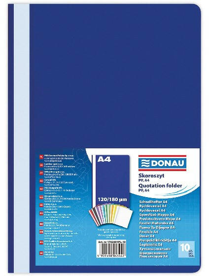 Gyorsfűző DONAU A/4 műanyag sötétkék Klasszikus PP gyorsfűző dokumentumok nyilvántartásához átlátszó, narancsos fedlappal, színes hátlappal, kivehető, kétoldalas, feliratozható oldalcsíkkal. A termék megfelel a hulladék újrahasznosítására és felhasználására vonatkozó "zöld pont" jelölésnek az EU szabályozás előírásai alapján.