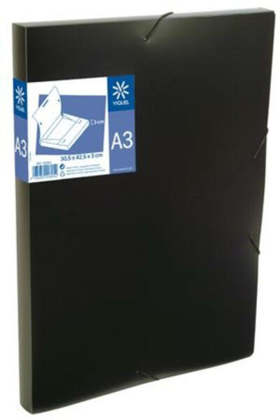 Gumis mappa, 30 mm, PP, A3, VIQUEL Essentiel, fekete (IV020805) - A3 méretű dokumentumok tárolására - rugalmas, polipropilén alapanyag - a behelyezett dokumentumok lyukasztást nem igényelnek - a sarkokban elhelyezett gumiszalaggal zárható - 3 belső fül a biztonságos tárolásért - méret: 425X305X30 mm - 80%-ban újrahasznosított anyagból készül Gyártó/első EU forgalmazó elé