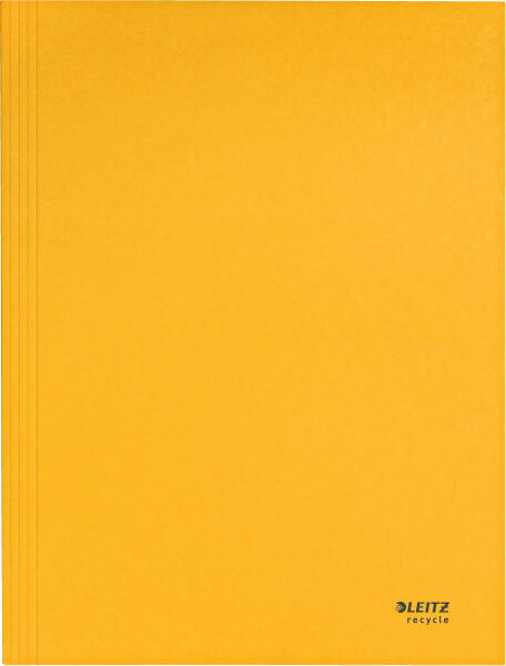 LEITZ 3 pólyás mappa, A4 karton, sárga, Recycle Attraktív, prémium minőségű 3-pólyás mappa. Ez a típus az egyik legnépszerűbb mappa dokumentumok védelmére és szállítására. Belső fülekkel a dokumentumok kiesésének megakadályozása érdekében. Újrahasznosított, erős kartonból, mely 100%-ban újrahasznosítható. Blue Angel tanúsított termék. Tökéletesen illik a Lei