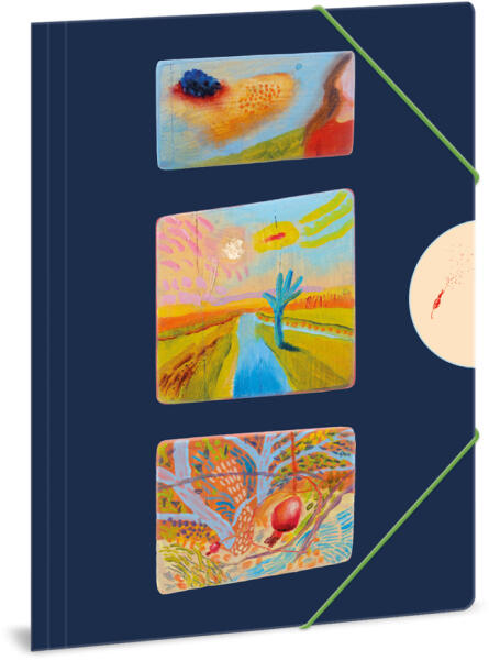 A/4 méretű gumis dosszié iratok, füzetek tárolására. 350 gr-os vastag kartonból, színes gumi zárópánttal. Vetlényi Zsolt képzőművész egyedi tervezése "Az erdőn át mindig van rövidebb út" címmel. Leírás Vetlényi Zsolt képzőművész egyedi tervezése "Az erdőn át mindig van rövidebb út" címmel. Méret: A/4-es (240x330 mm) Anyaga: 350 gr-os, vastag karton Színes gumi