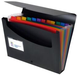 - A4 méretű dokumentumok tárolására - rugalmas, tartós, polipropilén alapanyag - regiszteres kivitel, feliratozható címkékkel és gerinccímkével - kívül fekete, belül különböző színű rekeszek - CD tartó és névjegykártya tartó zsebbel - méret: 330x235x50 mm Kiszerelés: 1 db/db