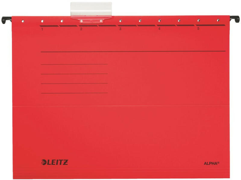 Függőmappa LEITZ Alpha Standard A/4 karton piros 25 db/doboz Függőmappa LEITZ Alpha Standard. Kiváló minőségű nyitott függőmappa. Fém fülek. Méret: A/4 Alapanyag: 210 gr-os karton, 100% újrahasznosított. Laminálással megerősített gerinc. Több színben. Víztiszta, műanyag címketartó, 6 cm hosszú. Változtatható címkeállás. Fehér címke 100%-ban újrahasznosított kart
