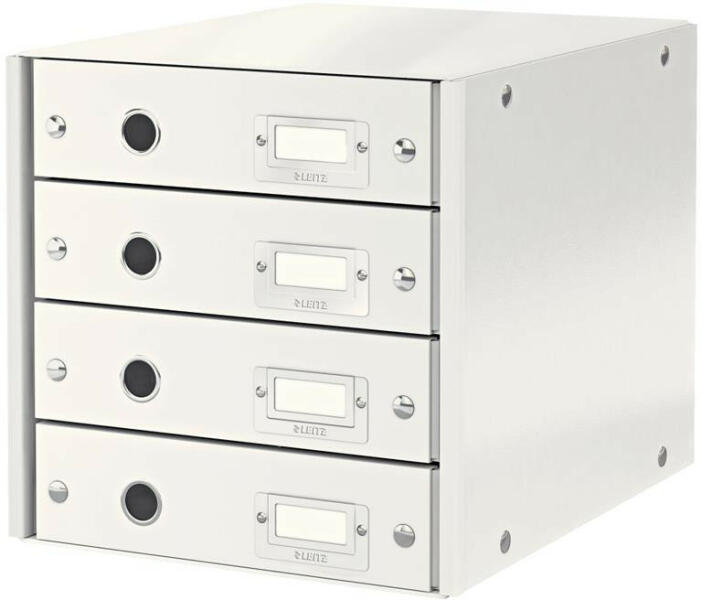 Leitz WOW Click & Store 4 fiókos irattartó A4 dokumentumok, fénymásolópapírok, mappák, tasakok, genothermek, jegyzetek, borítékok tárolásához. A patentos rögzítés nek köszönhetően gyorsan és könnyen összeállítható (ha nincs rá szükség, helytakarékosan tárolható)A fiókokon jól kivehető címketartó található a tartalom könnyű azonosításához és fém kihú