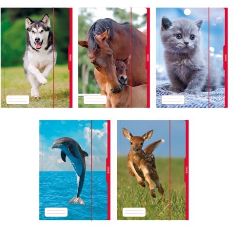 A3-as méretű iratok tárolására alkalmas gumis gyűjtőmappa Állatok, feliratozható, pólyás, magasfényű kartonból, 5 minta vegyesen.
