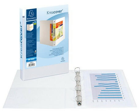 Gyűrűs könyv Exacompta Kreacover A/4 4 gyűrűs 47 mm gerinccel panorámás PVC fehér (30 mm) Gerincméret: 44 mm Gyűrűméret: 30 mm Gyűrűk száma: 4 extra erős, 2 mm vastag polipropilénből készült gyűrűs könyv 4 db D formájú gyűrűvel a fedlapon és a gerincen található átlátszó zsebek lehetővé teszik, hogy személyre szabott borítóval lássuk el a gyűrűs könyvet a