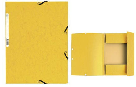 Gumis mappa karton Exacompta A/4 355g sárga Méret: 24x32cm (A/4 mérethez) Szín: sárga Vastagság: 0,4 mm Alapanyag: 355 g/m2 karton Kapacitás: maximum 250 lap Környezetbarát, FSC® tanúsítvánnyal rendelkezik Márványozott préselt kartonból készült 2 sarkán a mappa színével harmonizáló gumiszalaggal és 3 pólyával A legköltséghatékonyabb minőségi prespán gumis mappa Fel