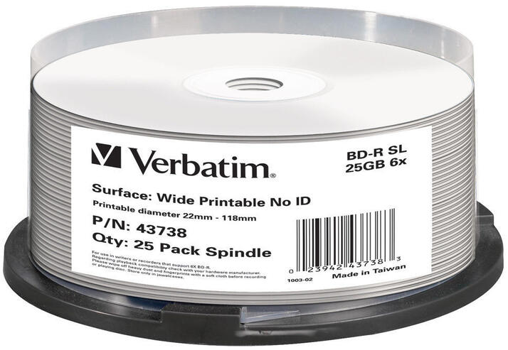 Az egyrétegű, 25GB kapacitású nyomtatható Verbatim BD-R Datalife Plus NO ID optikai lemezek elismert minőségű adathordozók. A 6x-os írási sebességet támogató Verbatim BD-R Blu-ray lemezei a hagyományos DVD lemezek tárolókapacitásának 6-szorosát nyújtják, lehetővé téve nagy felbontású HD video anyagok rögzítését és lejátszását. A Datalife Plus technológia segíts