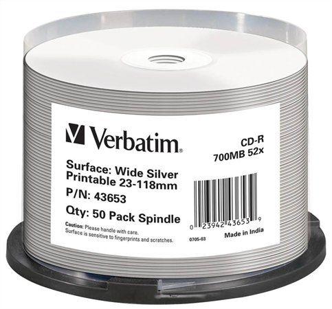Verbatim CD-R Wide Inkjet Professional 52x 700mb No ID Cake (50) CD-R 52x DataLifePlus Wide Inkjet Professional 50pk Spindle - No ID BrandA Verbatim CD-R/RW lemezei az MKM/Verbatim technológiáját alkalmazzák, amely tökéletes felvételi minőséget nyújt. A Mitsubishi Chemical K+F osztálya és annak szoros együttműködése a meghajtó-gyártókkal biztosítja a Verbatim lemezek széles ko