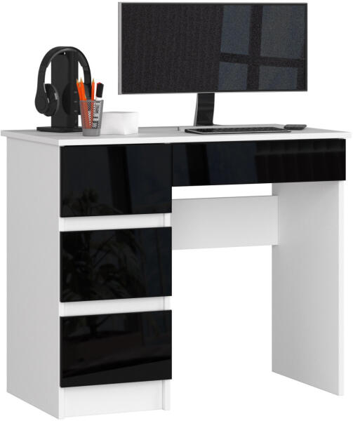 Modern, fiatalos számítógépasztal négy fiókkal, fehér korpusszal és magasfényű fekete frontokkal. Tökéletes választás otthoni munkához vagy tanuláshoz, praktikus tárolási megoldásokkal. Elegáns és praktikus számítógépasztal modern designnalAz AKORD CLP A-7 számítógépasztal a modern design és funkcionalitás tökéletes ötvözete. A fehér korpusz és a magasfényű f