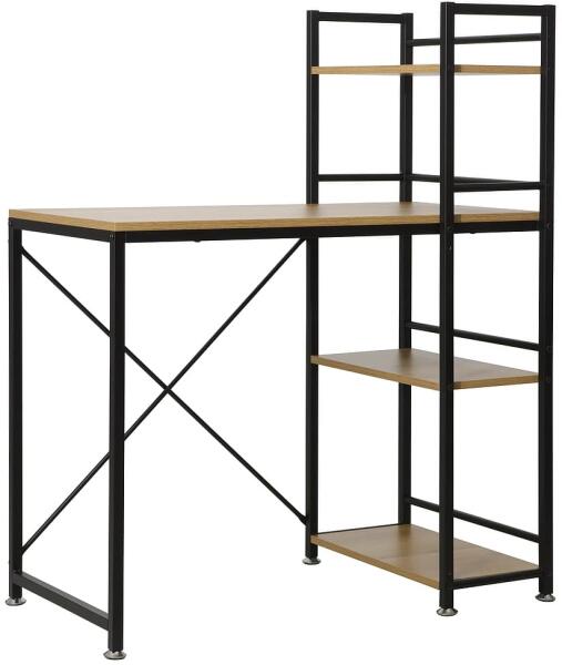 Clyde íróasztal Bármilyen tárolóhely jól jön egy dolgozó- vagy diákszobában. Ezért van a Clyde asztal beépített polcokkal ellátott polccal, ahol tankönyveket, irodai kellékeket vagy dísztárgyakat tárolhat. Az asztallap és a polcok anyaga >laminált forgácslap, a szerkezet többi része aztán fémből készült matt fekete színben. Az egyenesítő lábaknak köszönhetően